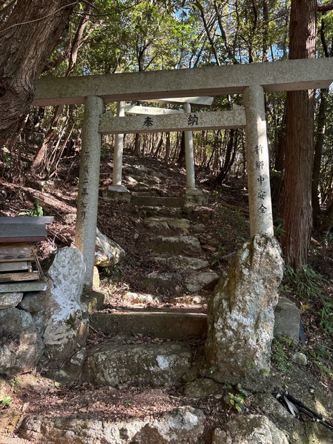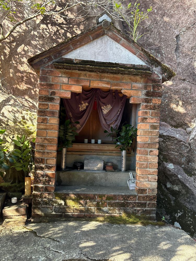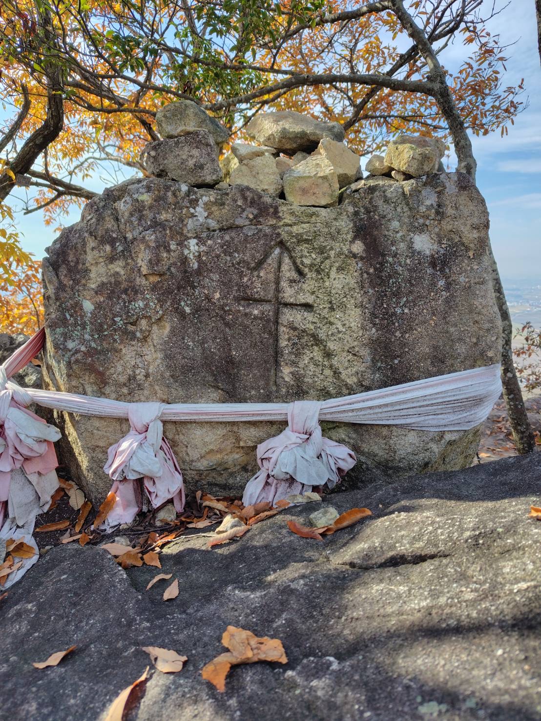 大岩を巻いて行くと、社が祀ってある場所に着く。大岩の山頂は、鉄製の梯子で登っていくが、細くて、怖い。希望者だけにしたいです。向かいの岩場も細くて足場が悪く、多分滑落事故があったところかなあと、思います。慎重に行動したい所である。10時頃には着く予定です。