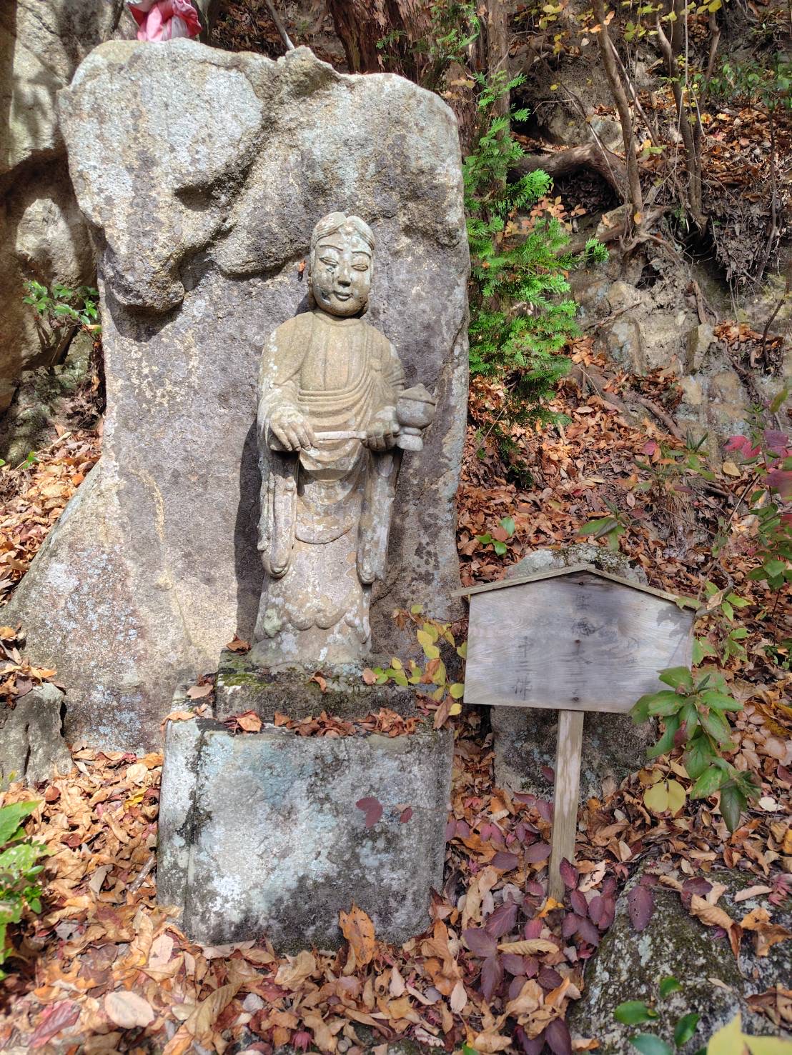 登山口から緩やかな登りを歩いていくと、夜泣き地蔵を通り、1時間半程で馬越峠に着く。茶屋跡や休憩所や句碑がある。