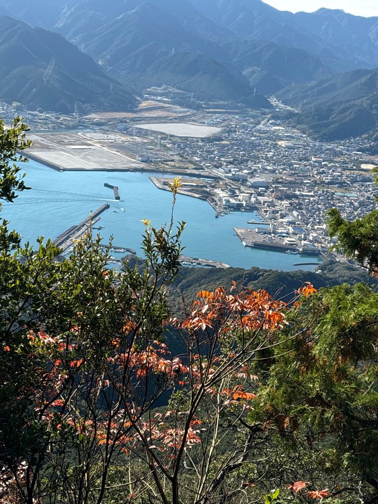 その後、おちょぼ岩に向かうが、アップダウンを繰り返す。落ち葉で足を滑らせそうで要注意。おちょぼ岩の上は狭いので、交代で登りたい。景観は素晴らしく、尾鷲湾が一望できる。昼食は、少し戻ってNHKの電波塔の所で食べることとします。下山はルートを北コースを降ります。途中で往路歩いたところで合流し馬越峠へと下りてくるが、階段道も歩きにくく、傾斜もあるので注意して歩きたい。馬越峠から熊野古道を歩き。2時半頃には下山する予定です。