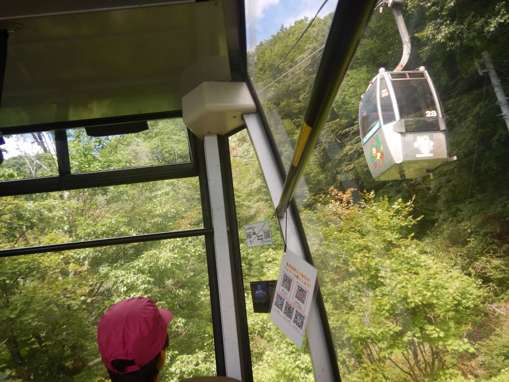 標高差610mのロープウェイに15分乗車します。立ち席12乗りですが、6人が適当です。樹林帯をかすめる様に上がるので例会当日は鮮やかな紅葉を期待します。次に2人乗りと4人乗りリフト2本(7分ずつ)で標高1600mの展望台到着。ここからは南アルプスが望めます。