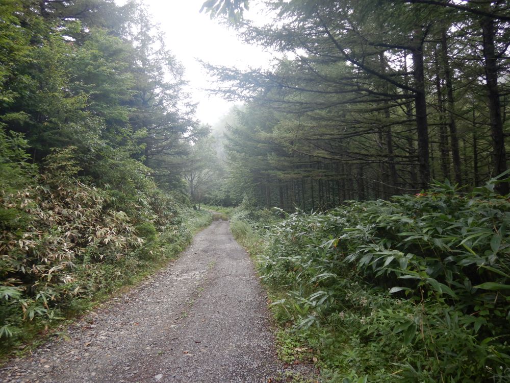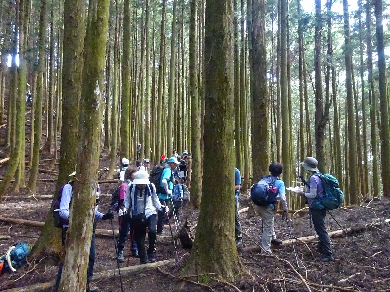 予定より10分早くスタート。ぽつりと小雨が当たり、山慣れたみなさんは樹林帯に入るからカッパはノーとザックカバーだけをかけて仕切り直しのスタート。