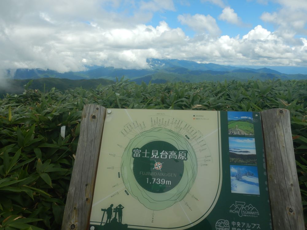 高原バス(リフト終点からで麓からではない)が通る舗装路を歩きますが意外なことに下り坂が多いです。カラマツ多く黄金色に輝けば素晴らしいでしょう。50分ほどで神坂峠。ここから東山路の山道を行きます。ササ原に達すれば展望が開けてきて気持ち良い天空の散歩道です。1739mの富士見台からは日本100名山のうち23座、そして鈴鹿山系もの大展望が広がります。