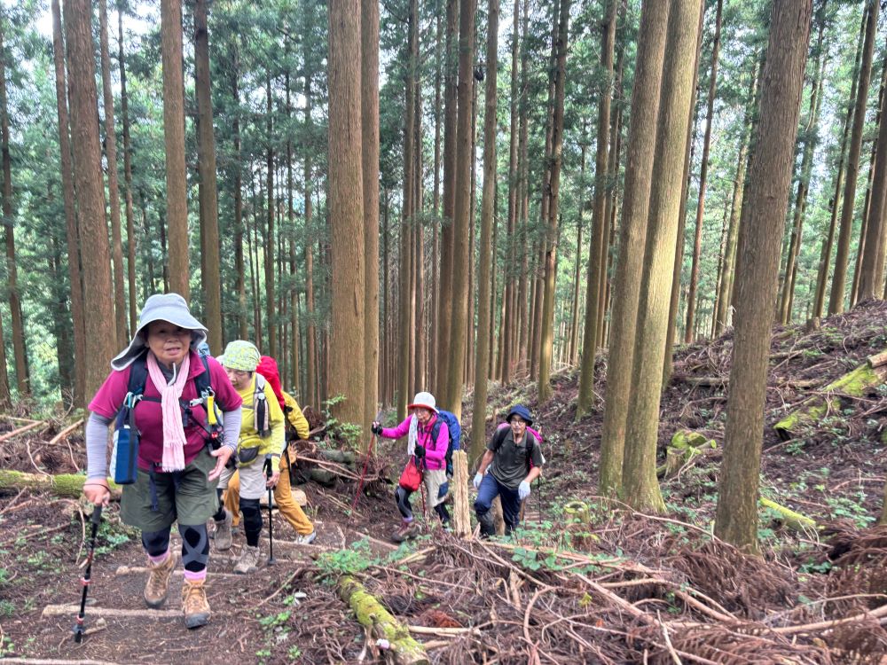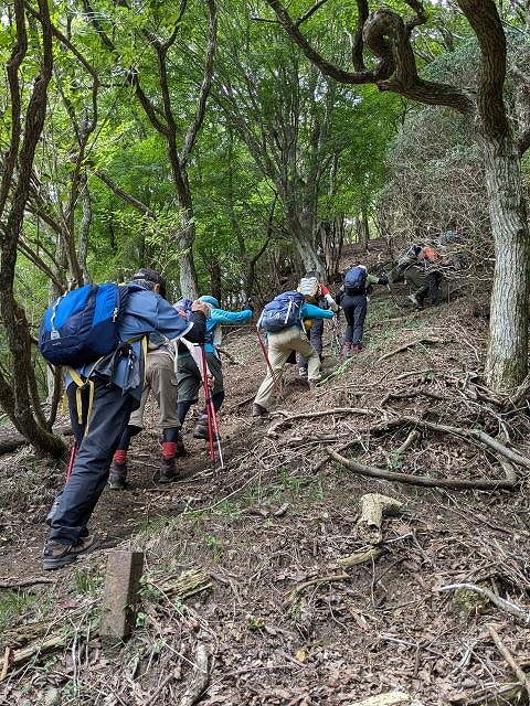 稲子山から経ケ峰を目指し、時計回りの周回コースですが、ここからも急登ありのアップダウンの道が続きました。体調が良くない方が1名出て症状から判断し、エスケープルートの笹子谷林道コースで下山しました。(3名の付添担当者により無事下山でき、帰りには体調も回復されていて安堵しました。)