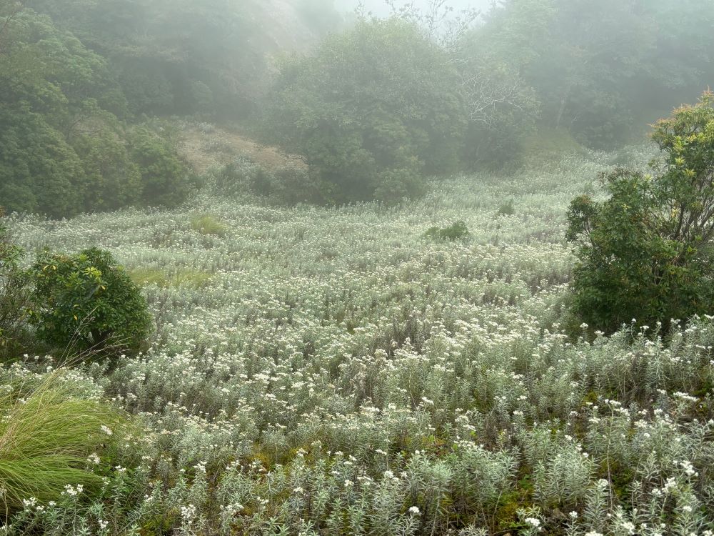 頂上→八丁平はガスガス→ハハコクサ群生地は満開!ガスっていて幻想的!わぁ、何回も登っているが知らなかったと感動の人もいました。
