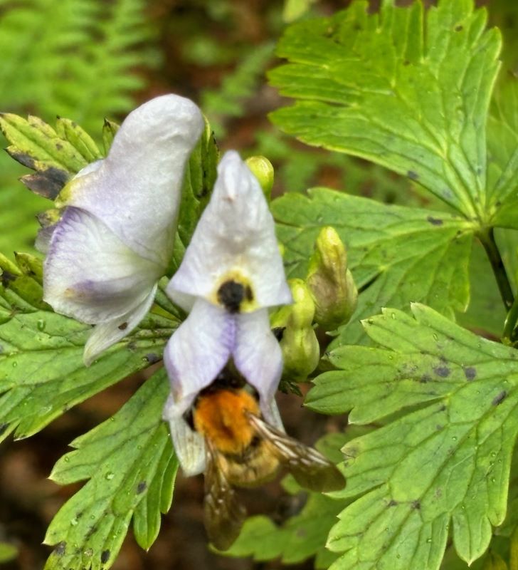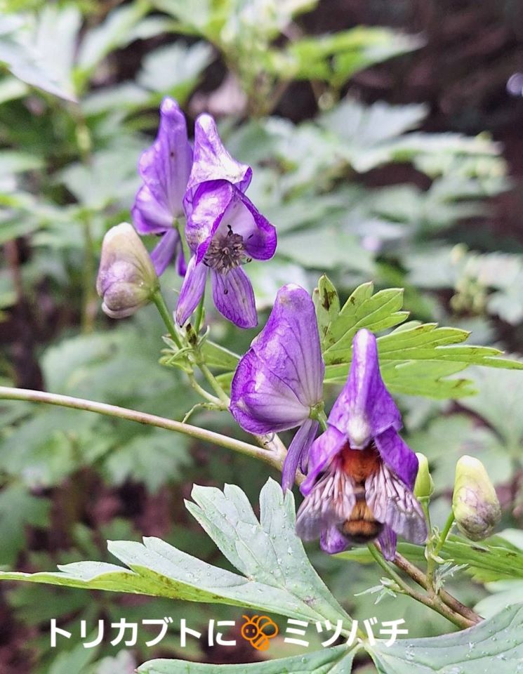 弓なりの枝に連咲きのブルーのトリカブト、白いトリカブト、ミツバチも舞っていた。