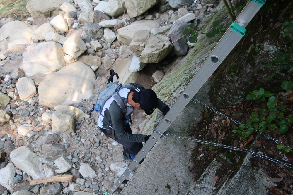 梯子あり渡渉ありのコースです。岩場の登りもあります。その後稜線の長い登りがつづきます。