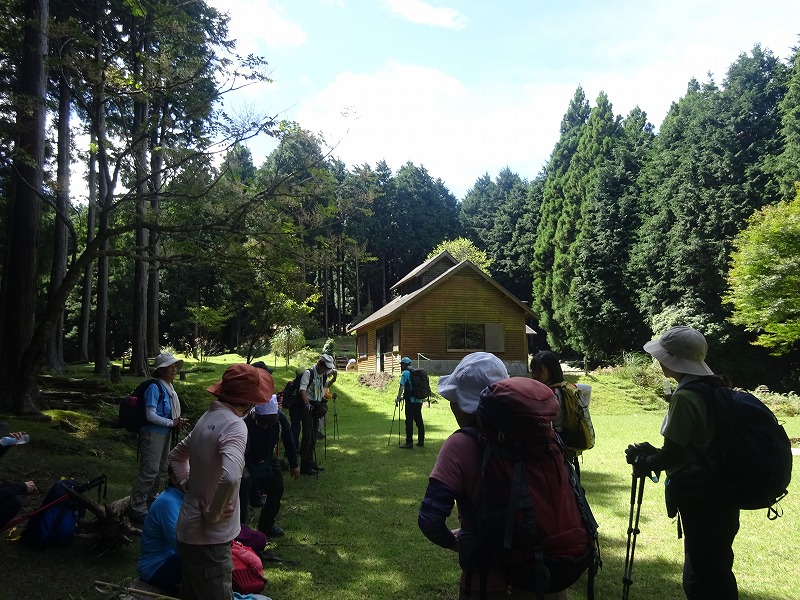 九十九登りのノボリオは霧雨、ミストを浴びて風もあり涼しい。トイレのある休憩所に着く頃は雨は上がっていた。3班が遅いので休憩所の中に入り観察、焚火ができるんだと、(樹氷登山で有名です。)