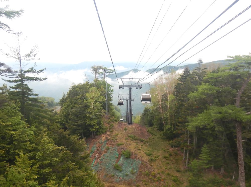 朝一番のスキー場ゲレンデの登りに汗をかきましたが、微かに笠ケ岳や槍ヶ岳も見えてテンションもあがります。