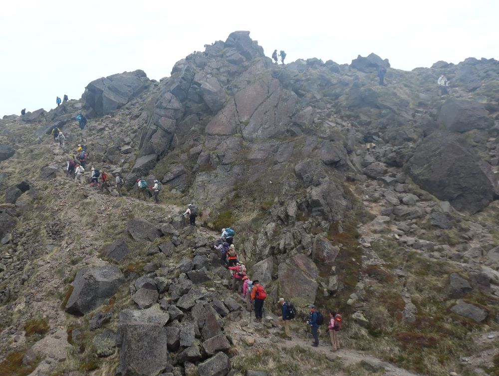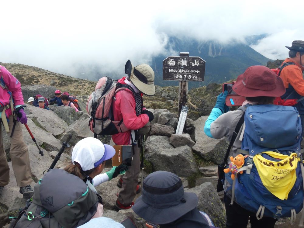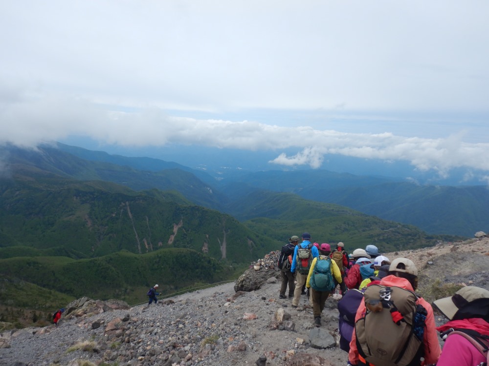 2日目はいよいよ日本百名山、日光白根山に登ります。心配した昨夜半の雨は上がったものの雲の残る空の下ロープウエイ乗り場から体操をしてスタートです。正面にこれから目指す白根山の荒々しい山頂部が見えワクワクドキドキです。最初は起伏の少ない整備された木道の散策路を歩き、赤い鳥居の二荒山神社を過ぎると徐々に高度を上げてゆきます。すでに2000mを超えているので少々呼吸がし辛く感じますが途中コマクサ、ミネザクラなどの花々が励ましてくれます。何度か急登を凌ぎ2400mくらいまで来ると眼下に雲海が見えてきました。樹林帯を過ぎ岩場が広がる歩きにくいガレ場を頑張ると奥白根神社に立ちすぐ山頂です。お昼をいただきガスの切れ間から眼下に見えるエメラルドグリーンの五色沼を狙って写真タイム。もと来た道を滑らないよう慎重に降りてロープウエイ乗り場にあるロックガーデンでゆっくり休んで降りました。2日目の宿は伊香保グランドホテルです。温泉につかりビュッフェと飲み放題で疲れをいやしました。