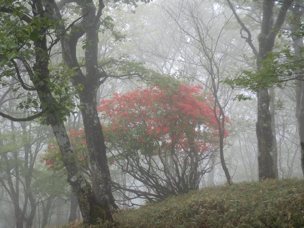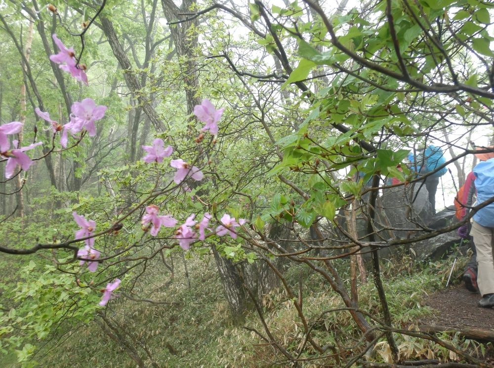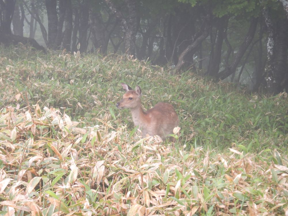 3日目は赤城山に登ります。未明に雨が降り、委員でミーティングの結果、昼前には上がると予想し合羽を着て決行となりました。登山口から猫岩を超え滑りやすい岩の急登をゆっくり進みます。シロヤシオやツツジが咲いています。小雨の降る中、長い登山道をこれでもかと歩くとやっと主稜線に出ますがガスっていて大沼どころか回りは何も見えません。徐々に雨も上がり黒檜山山頂に到着。小休止し行動食を食べ駒ヶ岳に向かいます。途中、小鹿に出会いました。そばに寄っても逃げず、ポーズ?まで取ってくれてみんなで写真タイムです。駒ヶ岳からは基本下りです。階段状の道、手すりの付いた鉄の階段をここもすべらないよう慎重に。長い下りが終わるとバスが見えてきました。バンザイ!全員無事に降りてきました。