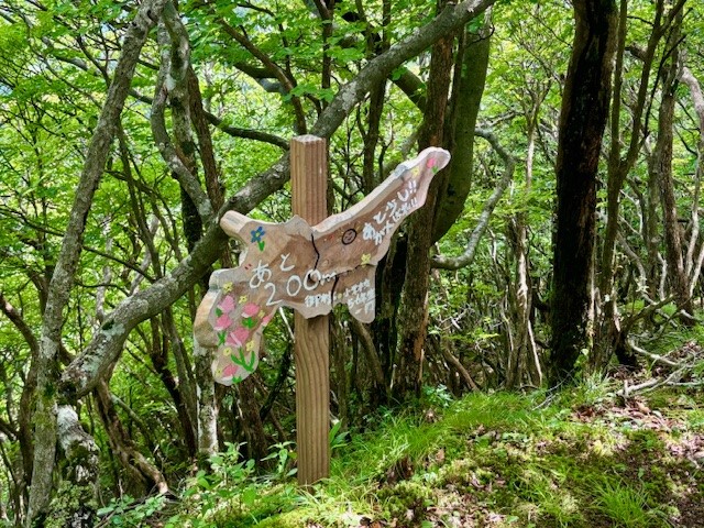 不動滝の分岐の手作りの丸太椅子で休憩、御杖村小学校5.6年生の手作りの応援メッセージ板を楽しみ、深緑の中、夏セミの鳴き声を聞きながらゆっくりと登って行きました。